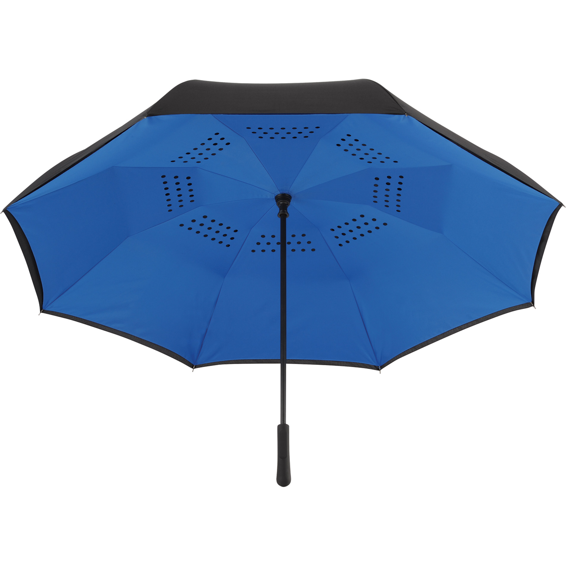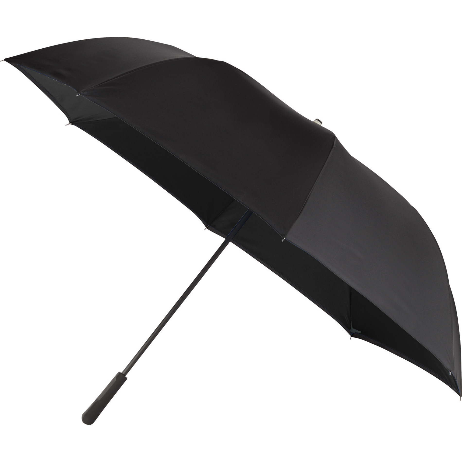 - Large, 58" Golf Umbrella that uses an innovative inverted folding design: opens and closes "inside-out" making it easier to keep the water contained and outer surfaces dry when opening and closing. The umbrella can stand on its own when closed allowing the water to drain out to dry. Manual opening with push button pinch-proof runner. Dual layer pongee canopy.